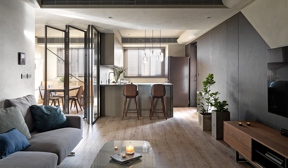 整个主空间南北通透,客厅其实采光不差,但涉及到休闲观影,夫妻俩更喜欢静谧深沉的休闲空间,所以平时即便太阳大,他们也喜欢拉上一半的百叶窗帘,打造一个静谧舒适的客厅区。站在餐厅一眼望去,很是解压。