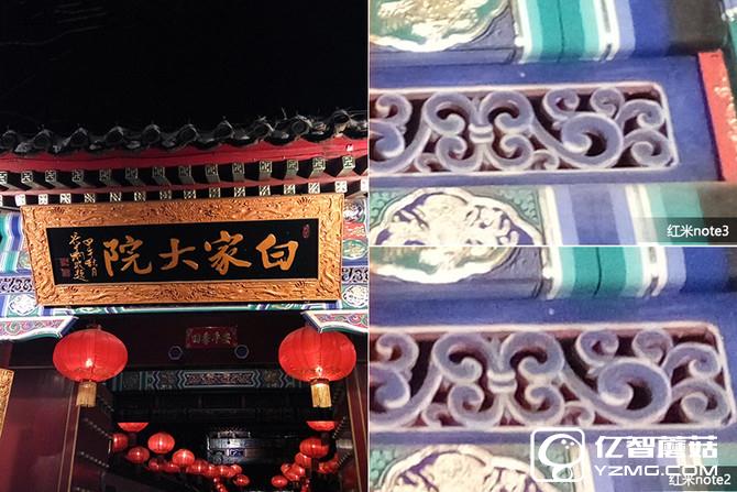 通过白家大院门楼的细节,我们不难发现这两款机子都在放大到100%依旧可以清新的细节效果,很难区分其高低。另外,我们通过大图的夜景样张对比发现,红米Note3在夜景方面微微占据一点优势,在目前这个价位可谓是非常前卫的。