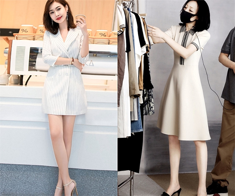 如果不喜欢纯色系,可以在款式上面动点小心思,黄色的颜色没有过多的装饰,只有单排扣装饰到腿部,这样的裙型虽然也很简约,但是少了些通勤风,所以职场连衣裙还是越简洁越大气,上面左右图就是很好的对比。