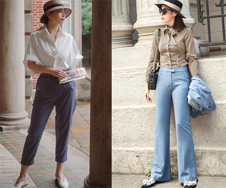 白衬衫是比较多,也可以试试和蓝色的裤子混搭,无论是哈伦裤还是阔腿裤,你会发现,两件纯色系基础款的单品混搭在一起,感觉很舒服,若是再搭配一双尖头鞋,有种自然轻松又极度舒适的治愈感。