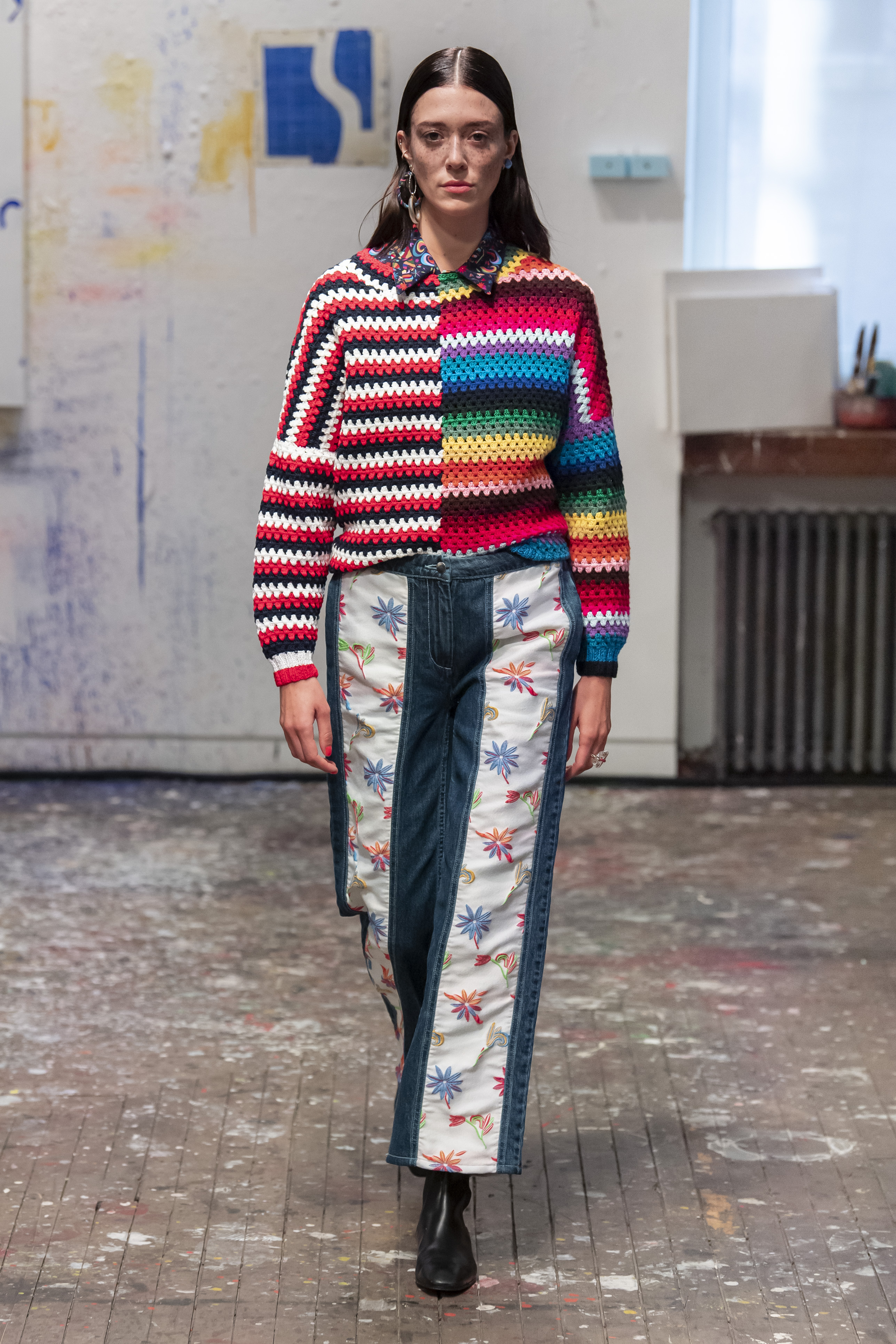 设计师的灵感来源于一条看起来跟那条裙子很相似的墨西哥毛毯。他对在加利福尼亚和墨西哥城的童年的回忆中完成了他的作品,很多作品都搭配晶莹炫目的梯瓦凉鞋,包括一些比较花哨的礼服。Cohen几乎以剪裁而闻名,但比起系围巾连衣裙和A字迷你裙,那套轻薄的天蓝色提花西服更引人注目。Cohen对华丽面料的鉴别力很好地体现在剪裁上。毫无疑问,这一季将成为裁剪界的一大流行趋势。