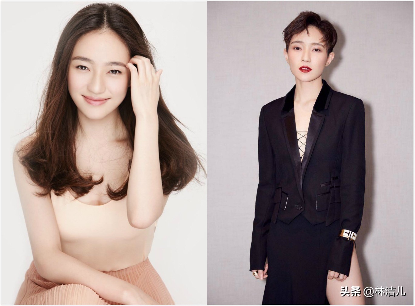 同时,尽量不要选择齐刘海,而是换成斜刘海来拉长脸型,林依晨就做了很好的示范,不仅视觉上显脸小了,还在张扬个性的同时,又符合她的甜美形象,整体显得干练且有内涵。